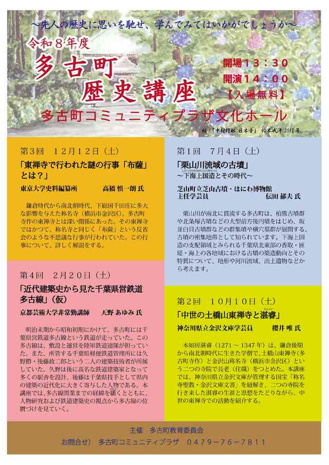 令和8年度 多古町歴史講座を別添チラシのとおり開催します。本年度は4回の開催を予定しています。